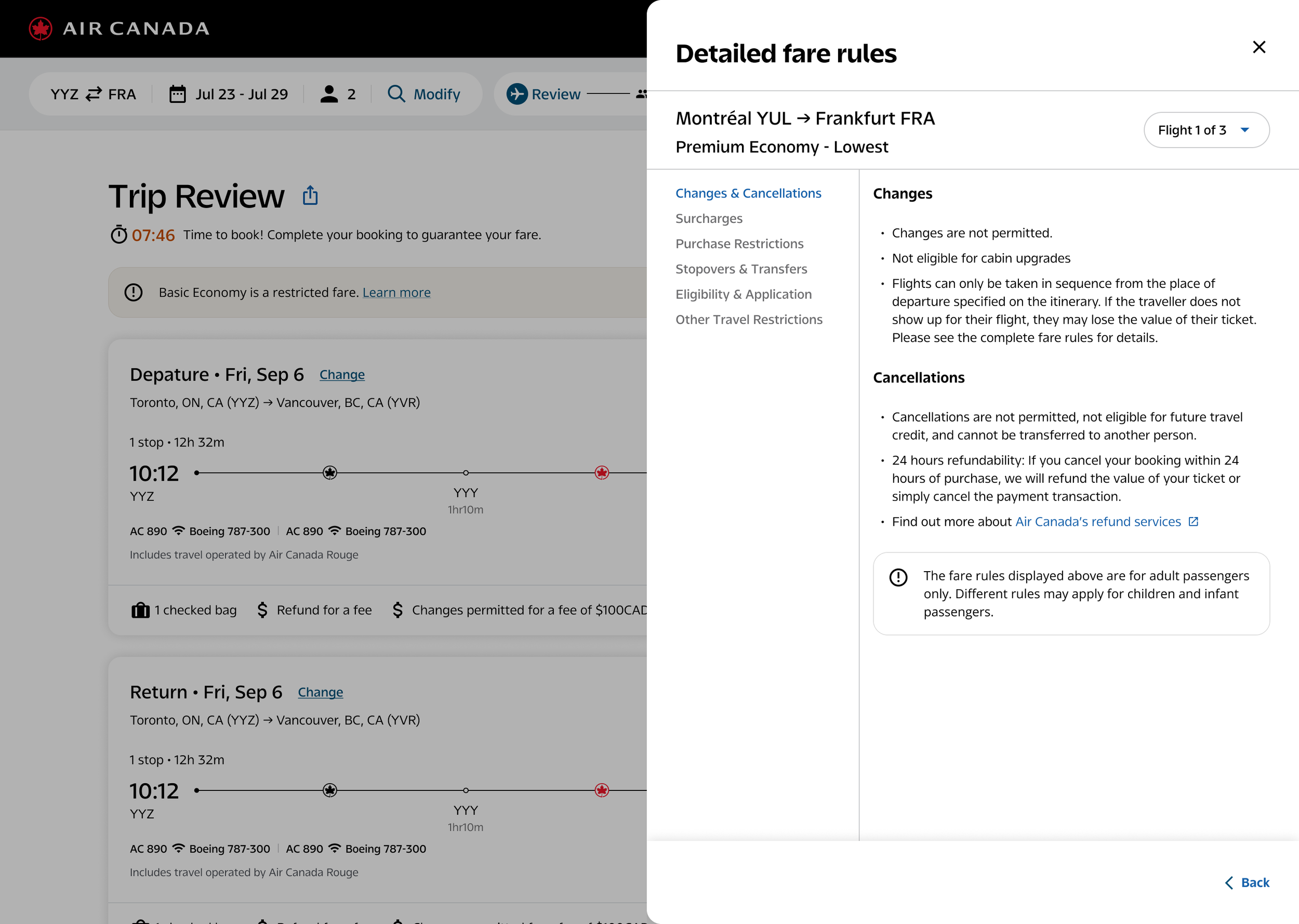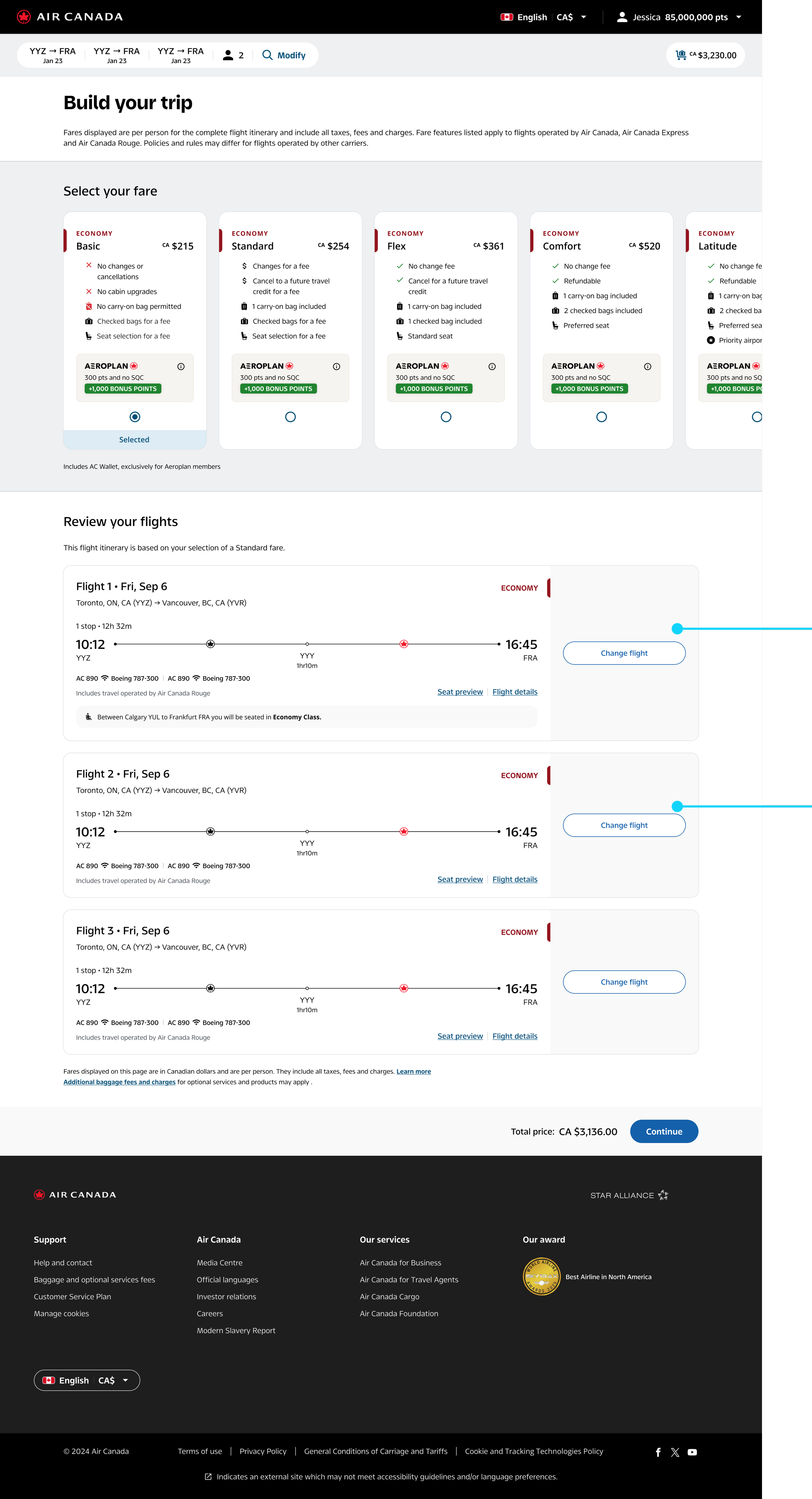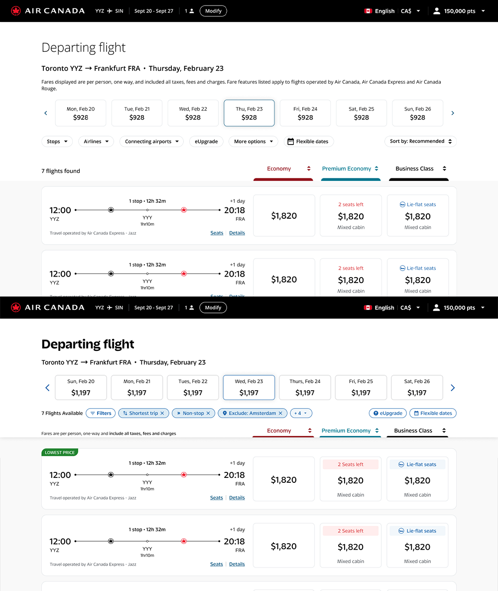 Air Canada's web booking flow had grown complex over time — and the design reflected it. Legacy components were inconsistently applied across the Book, Shop, and Manage experiences, and the Compass Design System had seen little adoption in production. My first step was an end-to-end audit: evaluating every screen against system standards, business intent, and real user behaviour at each stage of the journey.