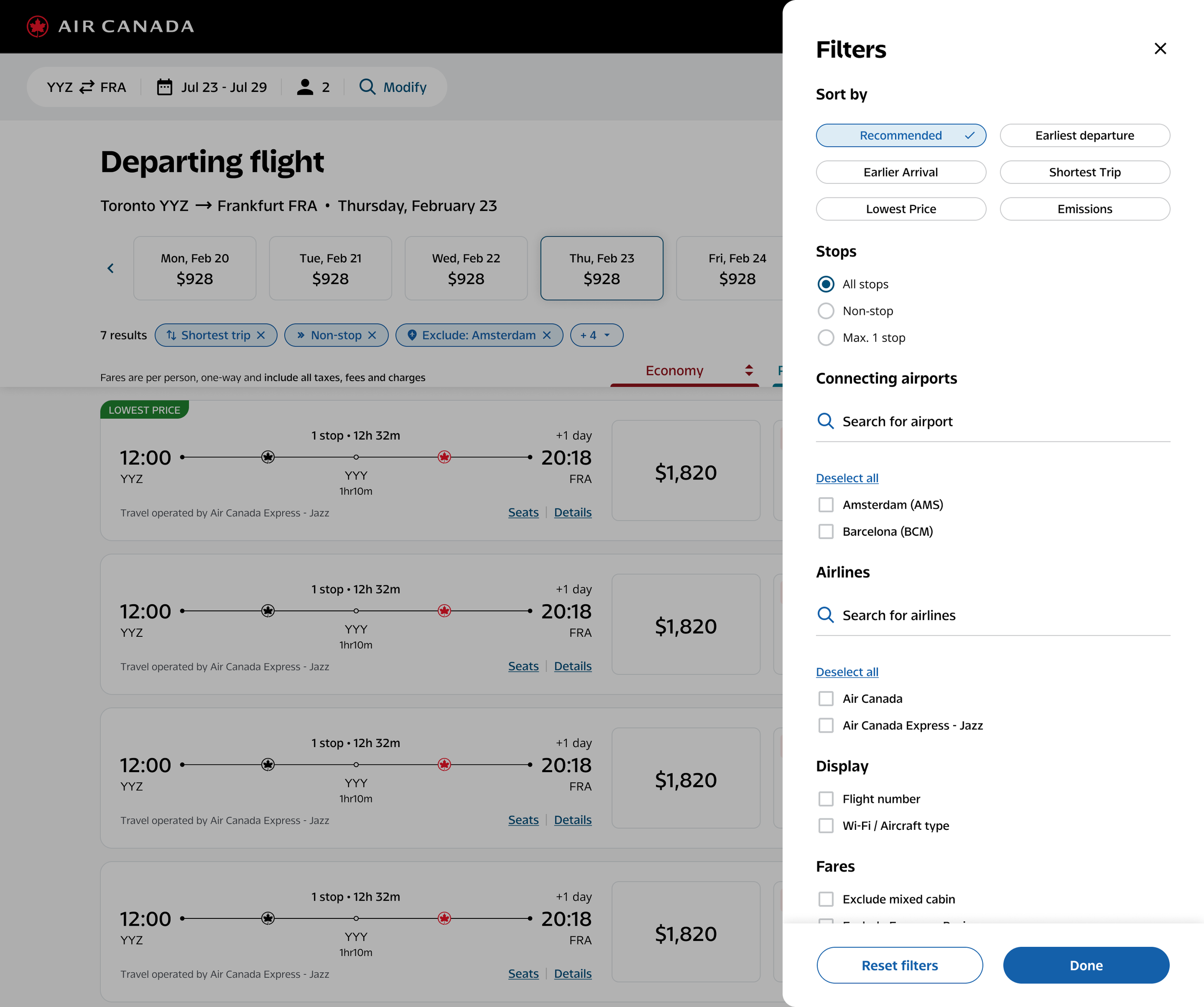 The flight results page before Compass implementation. Existing filter and detail patterns relied on constrained modals that didn't hold up across breakpoints.