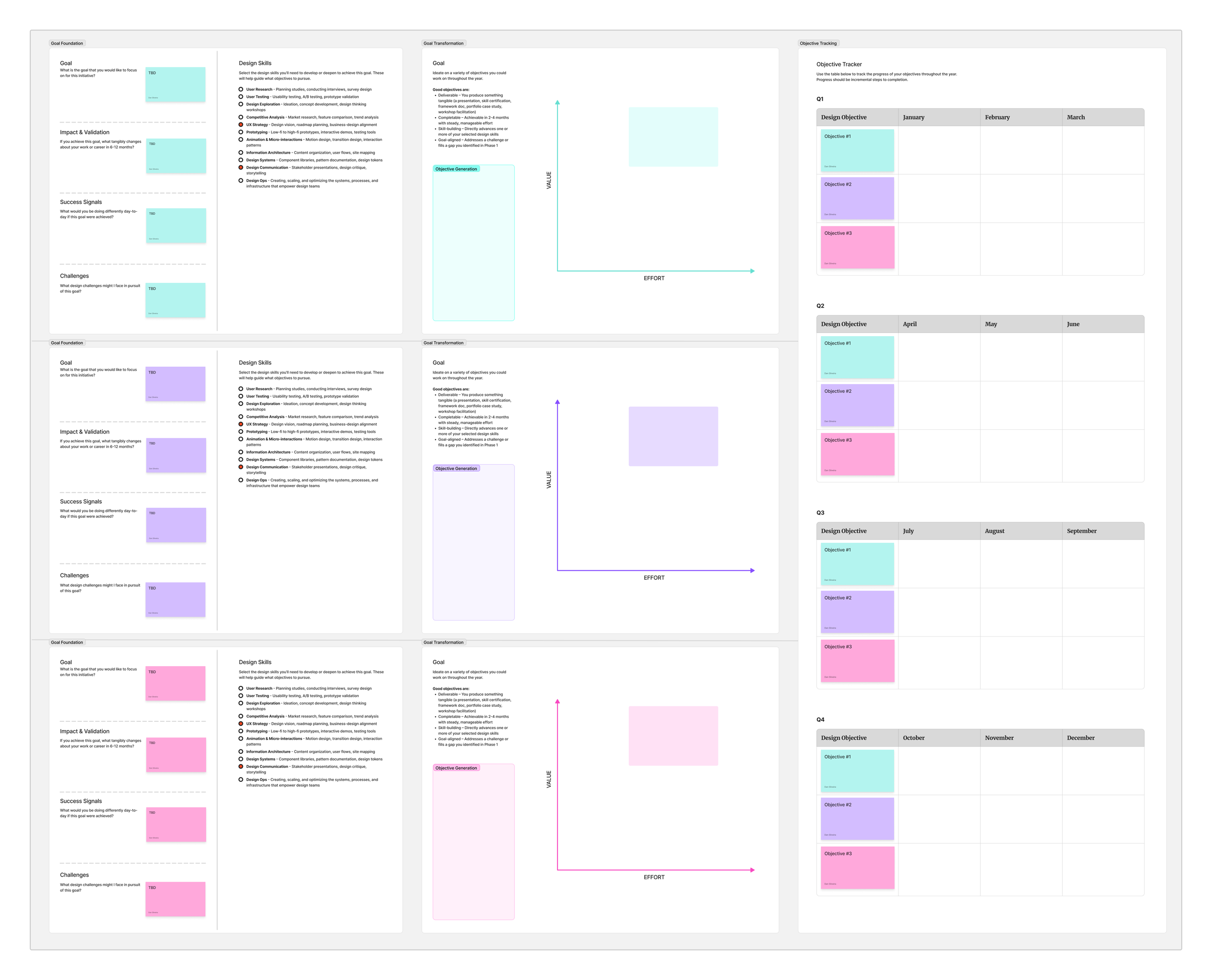 The challenge with coaching at this scale is making progress visible. Without structure, sessions become reactive check-ins. To address this, I developed a Goal Transformation framework: a workshop activity I ran with each designer to ground their three annual goals in concrete design skills, define what success looked like, and map out the effort required to get there. We then used our sessions throughout the year to track progress, unblock challenges, and adjust direction as the work evolved.