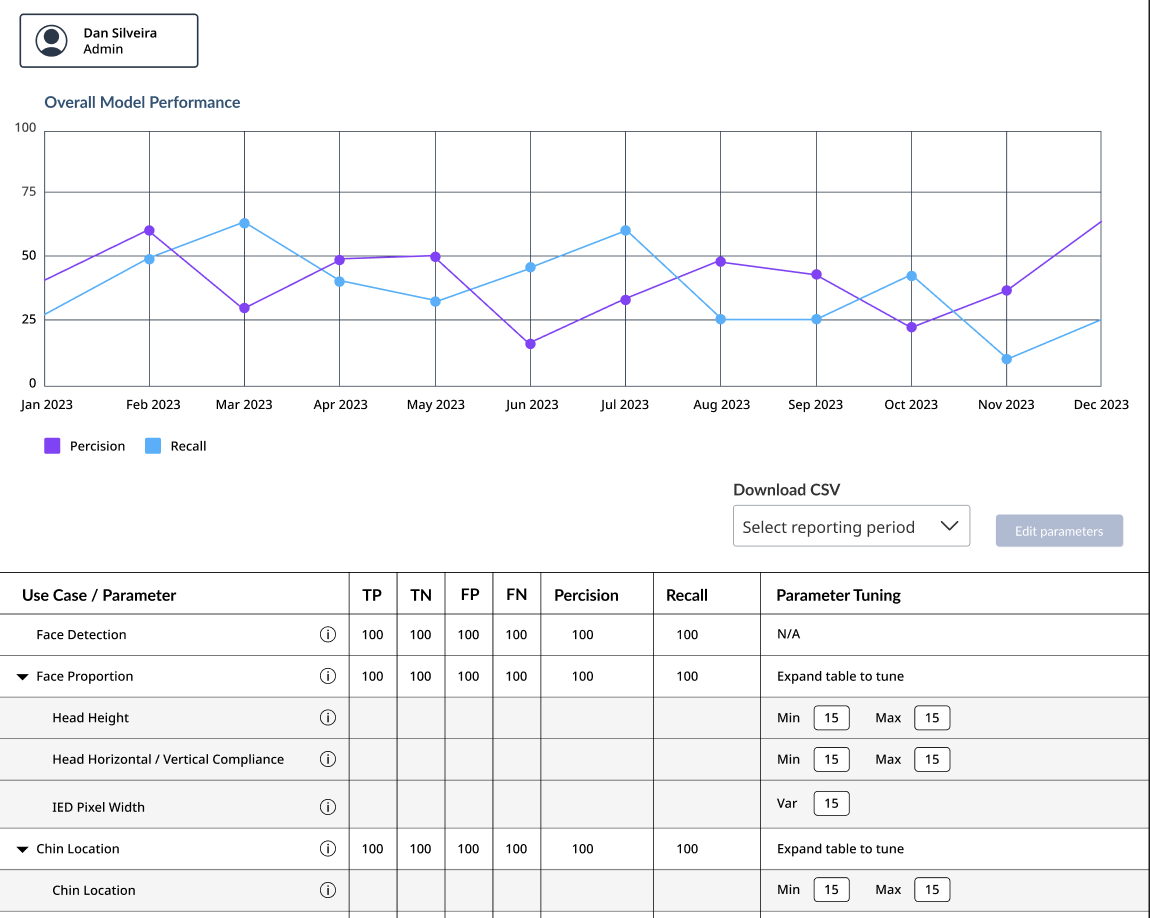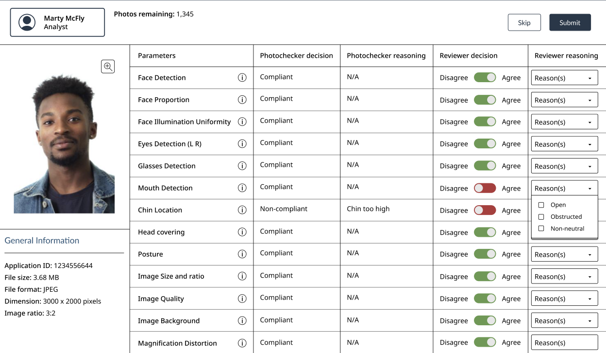Alongside the technical team, I also collaborated closely with the IRCC stakeholder team to create a process where humans would verify the AI's photo assessments until the model reached full confidence. This involved designing a user interface for employees to review the AI's analysis, as well as a page to adjust the model’s sensitivity for specific photo evaluation criteria. Developing these screens, alongside the computer vision functionality, was both challenging and rewarding, knowing how it would greatly accelerate the passport renewal process for citizens across the country if done right.