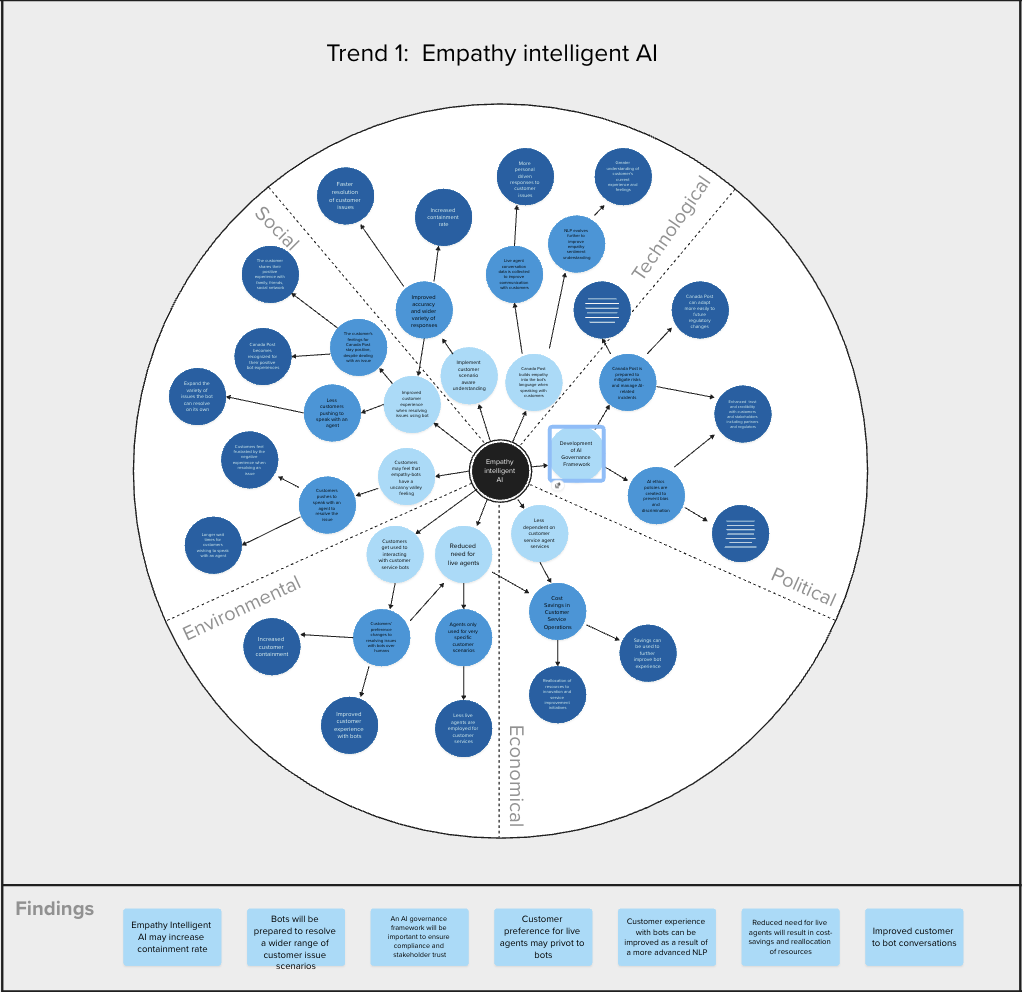 To explore how these trends may create risks or opportunities for Canada Post we perform a trend mapping and impact analysis activity called the Futures Wheel. This tool leverages five lenses (Social, Technological, Economical, Environmental, and Political) to extrapolate the causes and effects that may occur as a result of these trends existing within the parcel delivery industry or specifically within the area of virtual assistants and customer support.